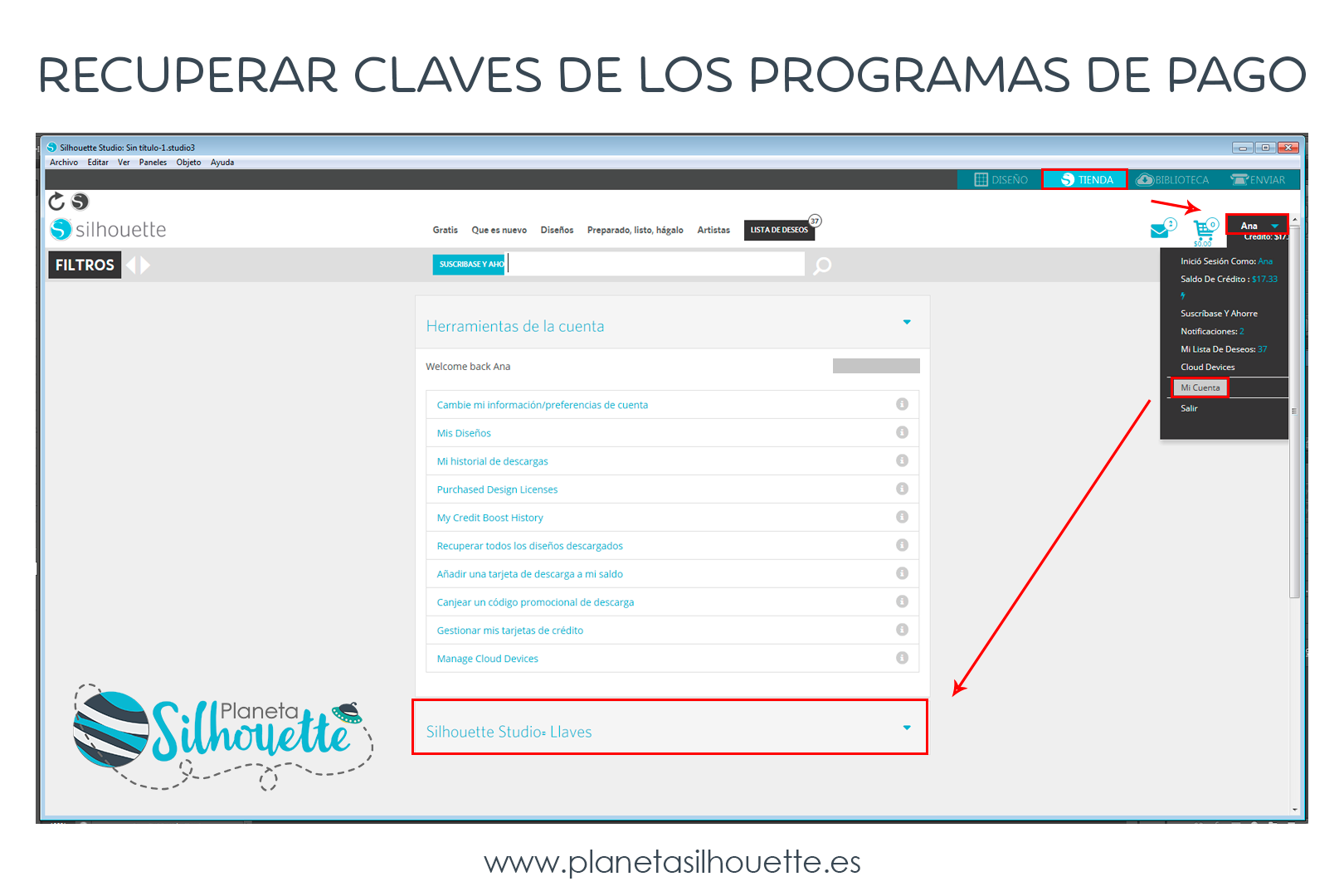 Si ya tenías tu código pero no recuerdas dónde está, puedes consultarlo en las opciones de tu cuenta que encontrarás accediendo a la Tienda de diseños desde tu programa de Silhouette Studio (ver imagen).