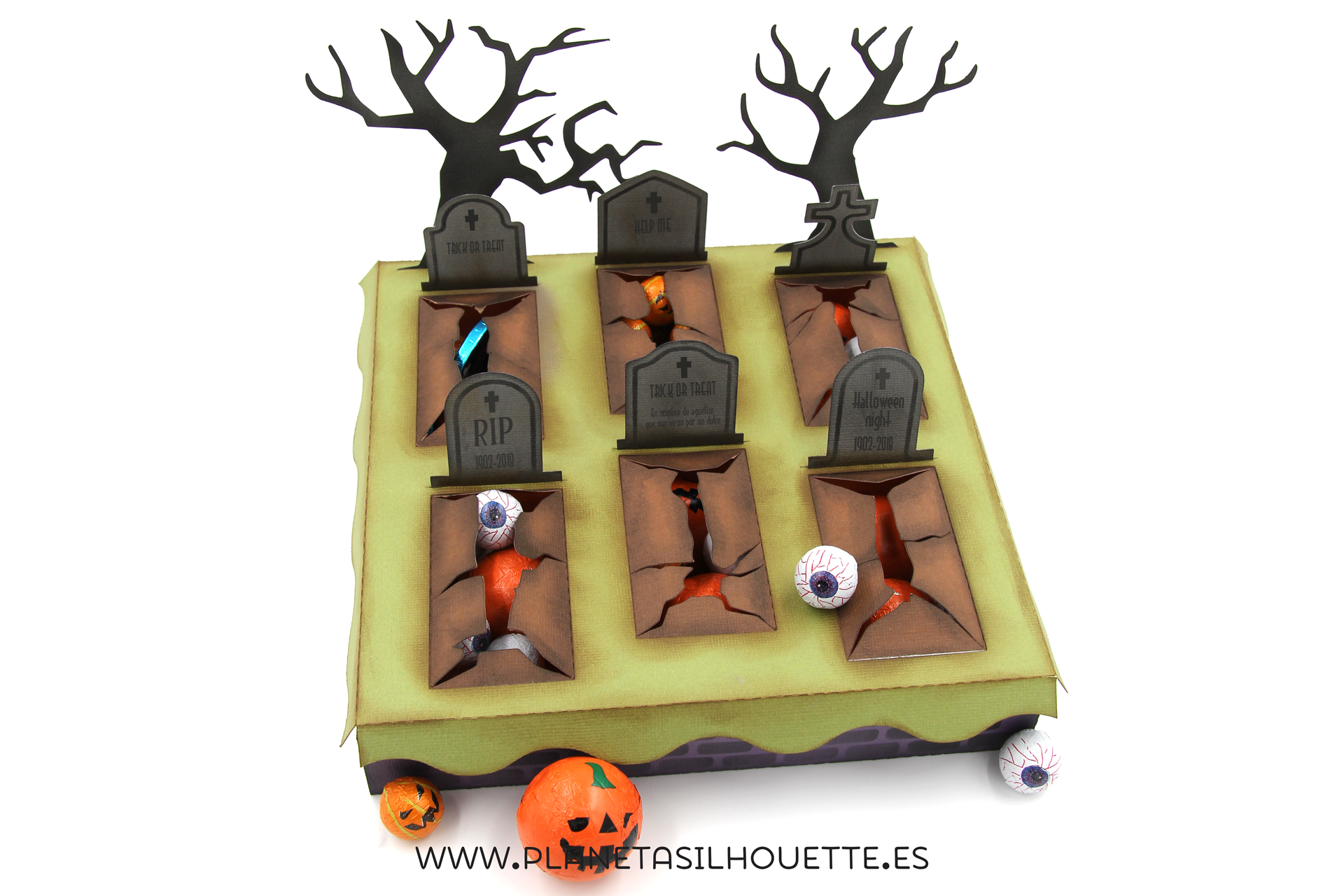 Dobla las solapas de las lápidas hacia atrás, las de los árboles para delante, y pégalas por detrás.