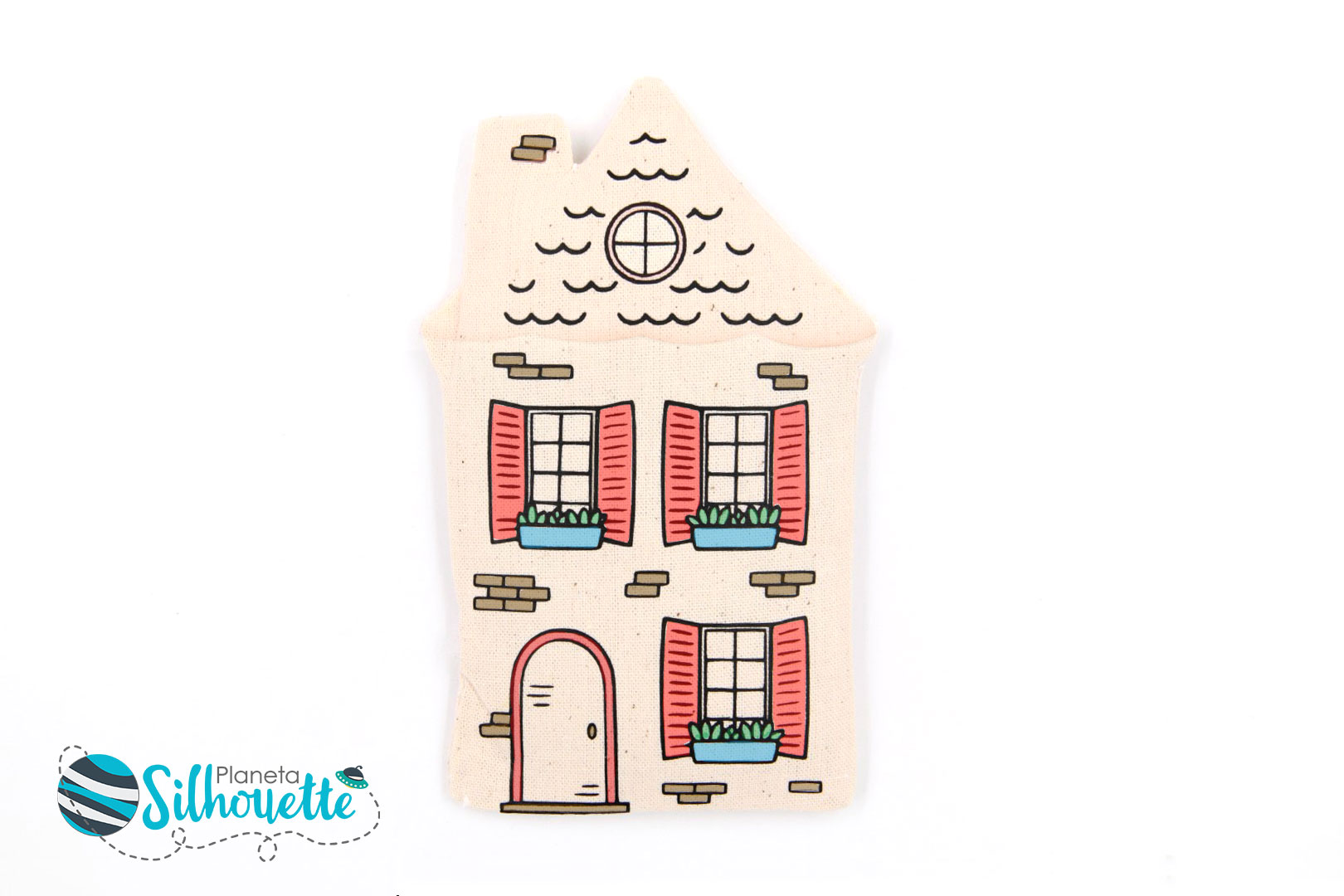 La casita no tiene mucho volumen, pero si que recomiendo en estos casos plancharlo con prensa térmica. Con la prensa aplastamos la casita de forma uniforme, y el vinilo se pega correctamente por todas partes.