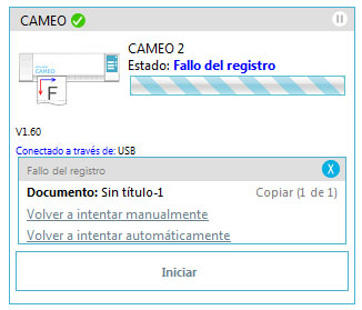Una vez que la Silhouette nos marca,en pantalla el fallo de registro, el programa nos da la opción de reintentarlo, y por norma general la gente no suele fijarse que nos salen unas opciones adicionales, que son las de intentar registrar de nuevo de forma automática o intentarlo de forma manual.