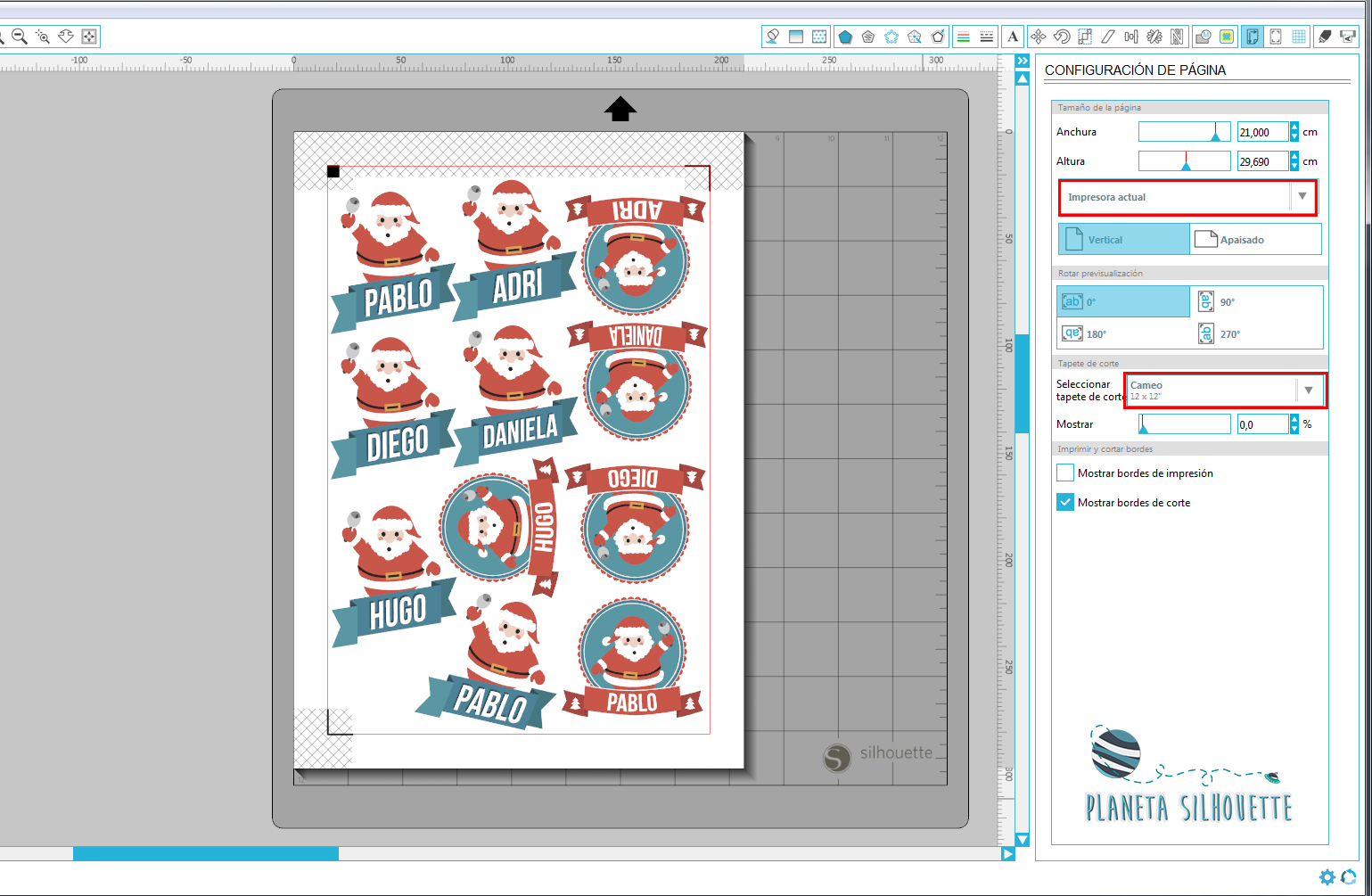 He configurado el documento en los ajustes de página, seleccionando el tamaño de página «Impresora actual», y en el Tapete de corte, el de la Cameo (12×12″). Y por supuesto, he activado las marcas de registro (Tipo 1: Cameo, Portrait)… Muy importante!, recordar que si vamos a hacer Print&Cut tenemos que activarlas (las márcas de registro sólo se ponen cuando hacemos imprimir y luego cortar).