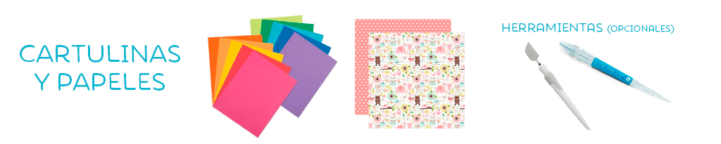 Para hacer estos proyectos no necesitamos más que lo básico que viene con la máquina (tapete y cuchilla), y nuestros papeles o cartulinas favoritas.