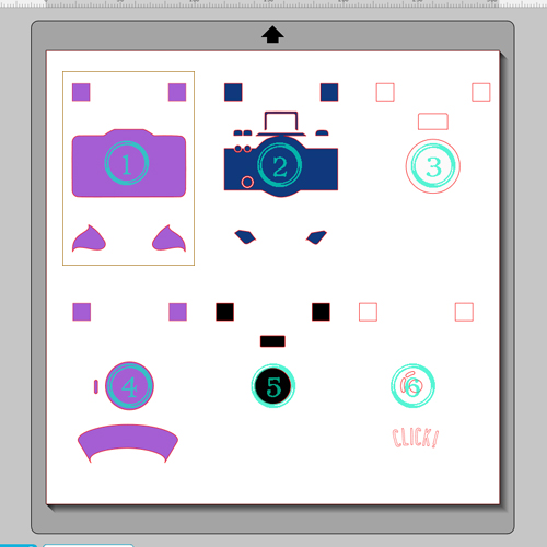 3) Es muy importante hacerse una idea de que parte va a ir pegada sobre la otra y en que orden, ya que en mi ejemplo, si sacase cortado todo lo de color lila de una vez, y lo pusiese como capa base, perdería el círculo morado que está en el objetivo de la cámara. Por tanto, en estos casos, habrá que cortar varias capas del mismo color pero con distintas partes del diseño.